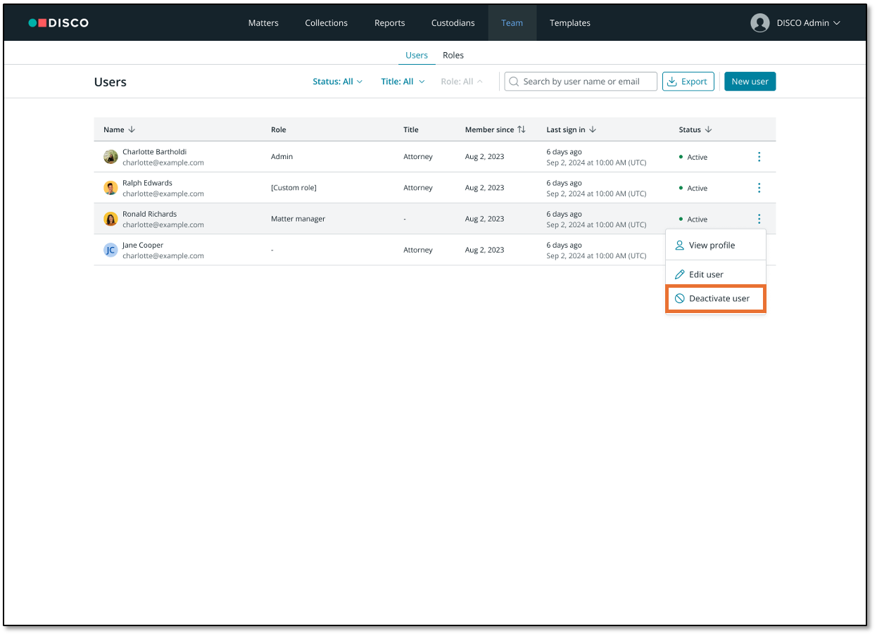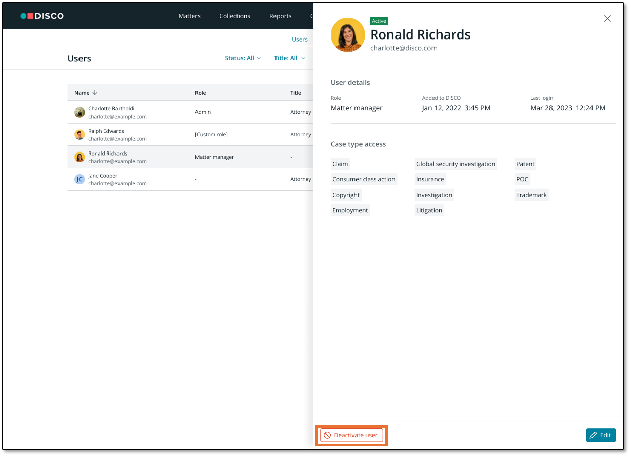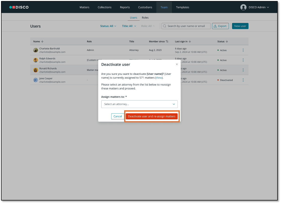 - If the user being deactivated is the attorney on any existing open matter, they cannot be deactivated without reassigning their open matters. Re-assign matters to another attorney and click Deactivate user.