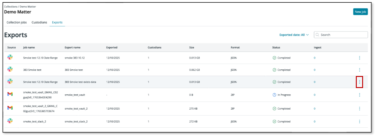 - Find the export you are looking to ingest and click on the