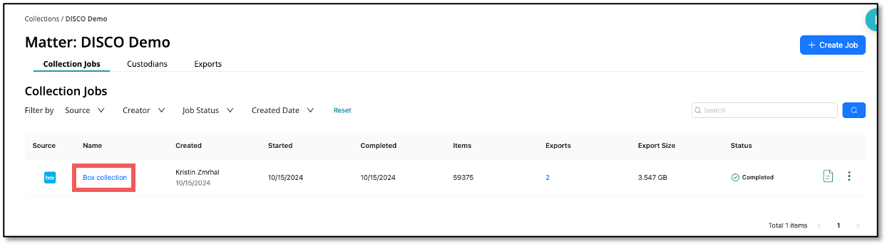 - Navigate to the Collection Job by clicking on the matter in the Collections Dashboard.